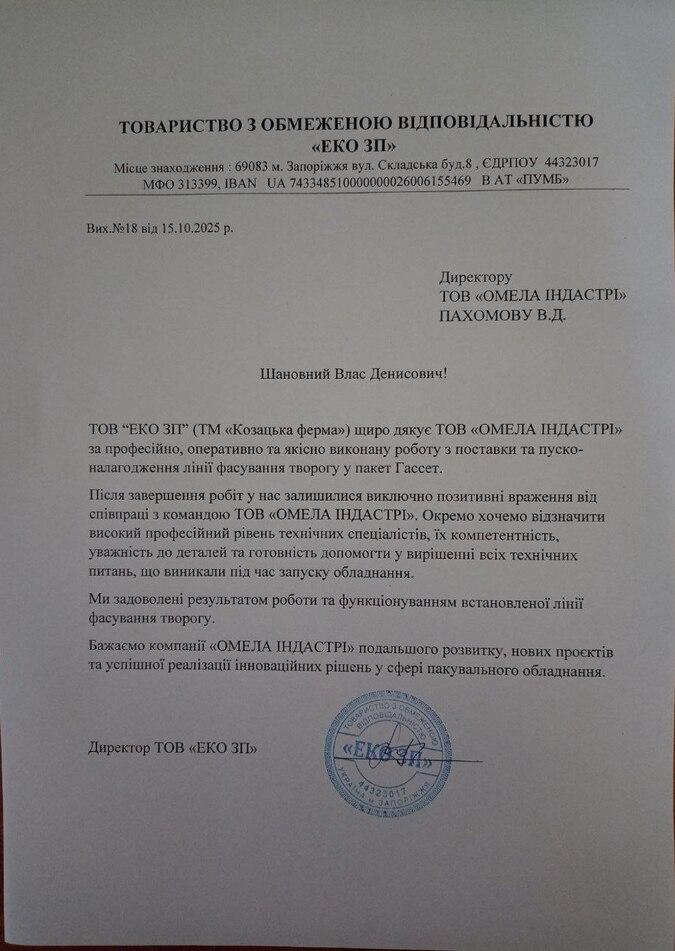 Автоматизация упаковки сыра в пакеты с жидкостью для производителя из Запорожья